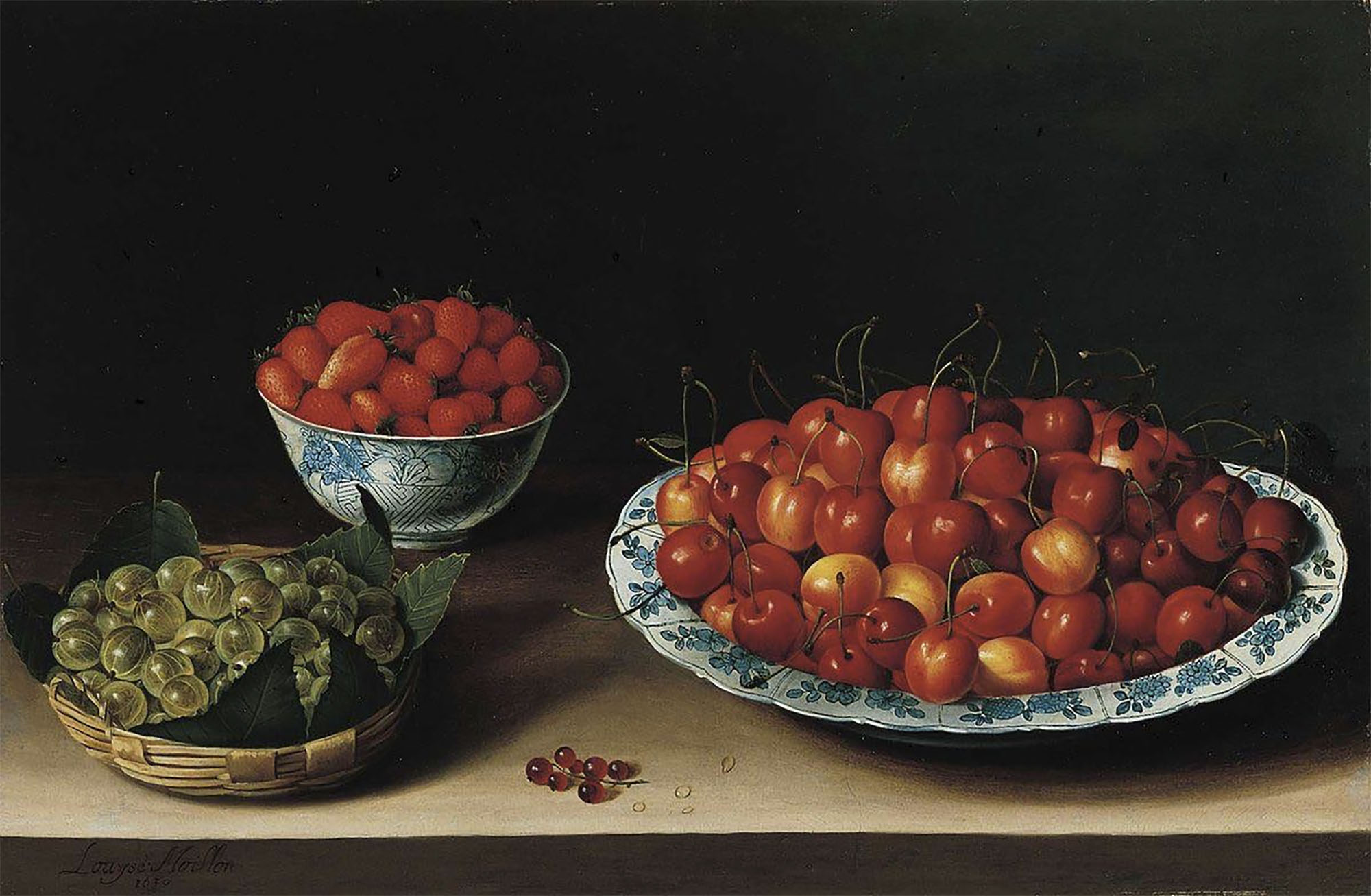 Still Life with Cherries, Strawberries and Gooseberries by Louise Moillon. 1630, oil on panel. The Norton Simon Museum, Pasadena, California.